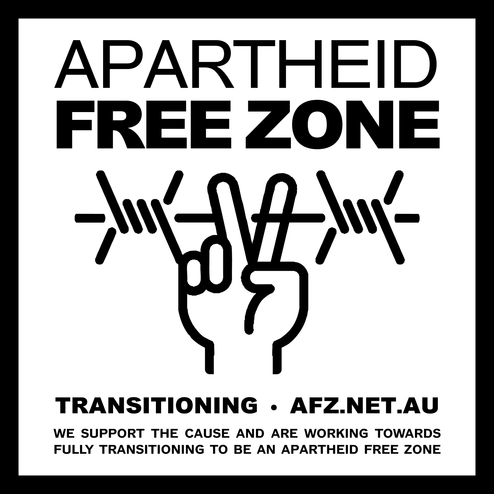 On signing up to be an AFZ, Venues will be deemed either a TRANSITION AFZ or an OFFICIAL AFZ based on how many of the global BDS targets they have boycotted, as well as where they are in boycotting these products.